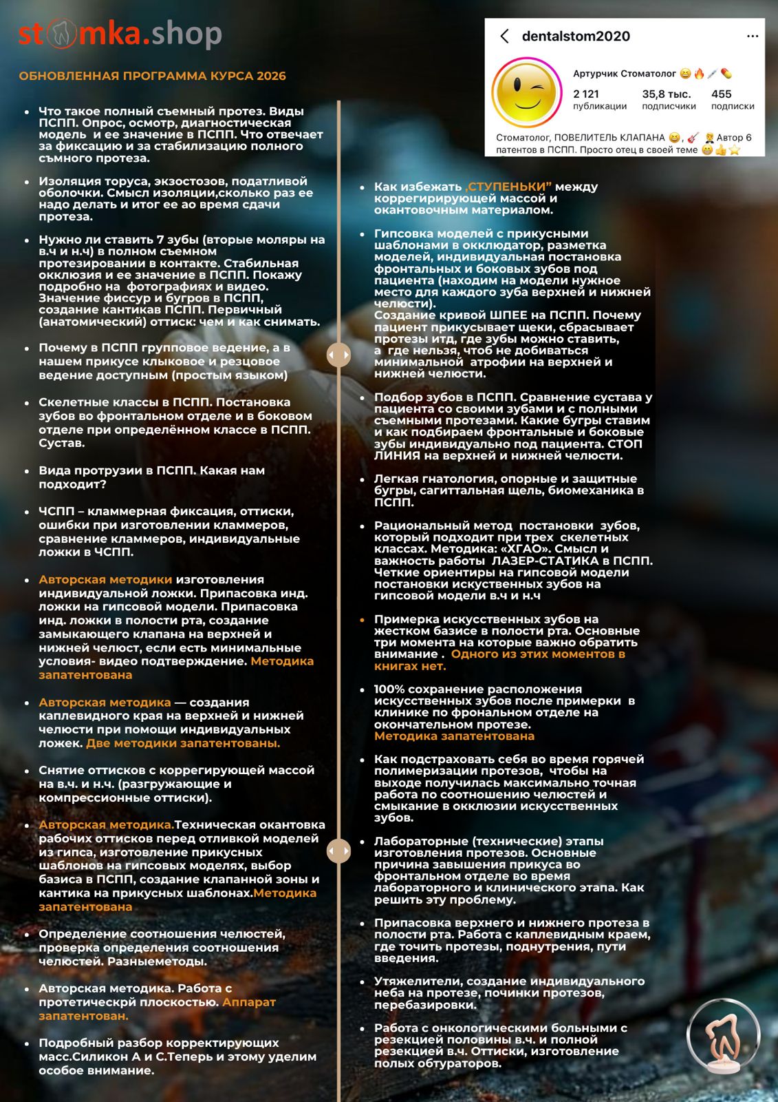 Врач стоматолог, зубной техник (работал 8 лет в сложном протезировании, занимался изготовление обтураторов после резекции полной и частичной в.ч.). Автор двух патентов. В своем курсе "Разоблачение полного съёмного протезирования" Артур Григорьевич разбирает рабочие моменты: от осмотра полости рта, до сдачи протезов, обучает курсантов классической и эксклюзивной авторской методике изготовления съемных протезов.