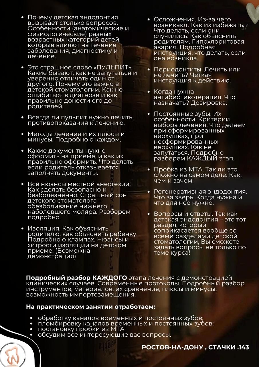 - Вопросы и ответы. Так как детская эндодонтия – это тот раздел, который соприкасается вообще со всеми разделами детской стоматологии, Вы сможете задать вопросы не только по теме курса!