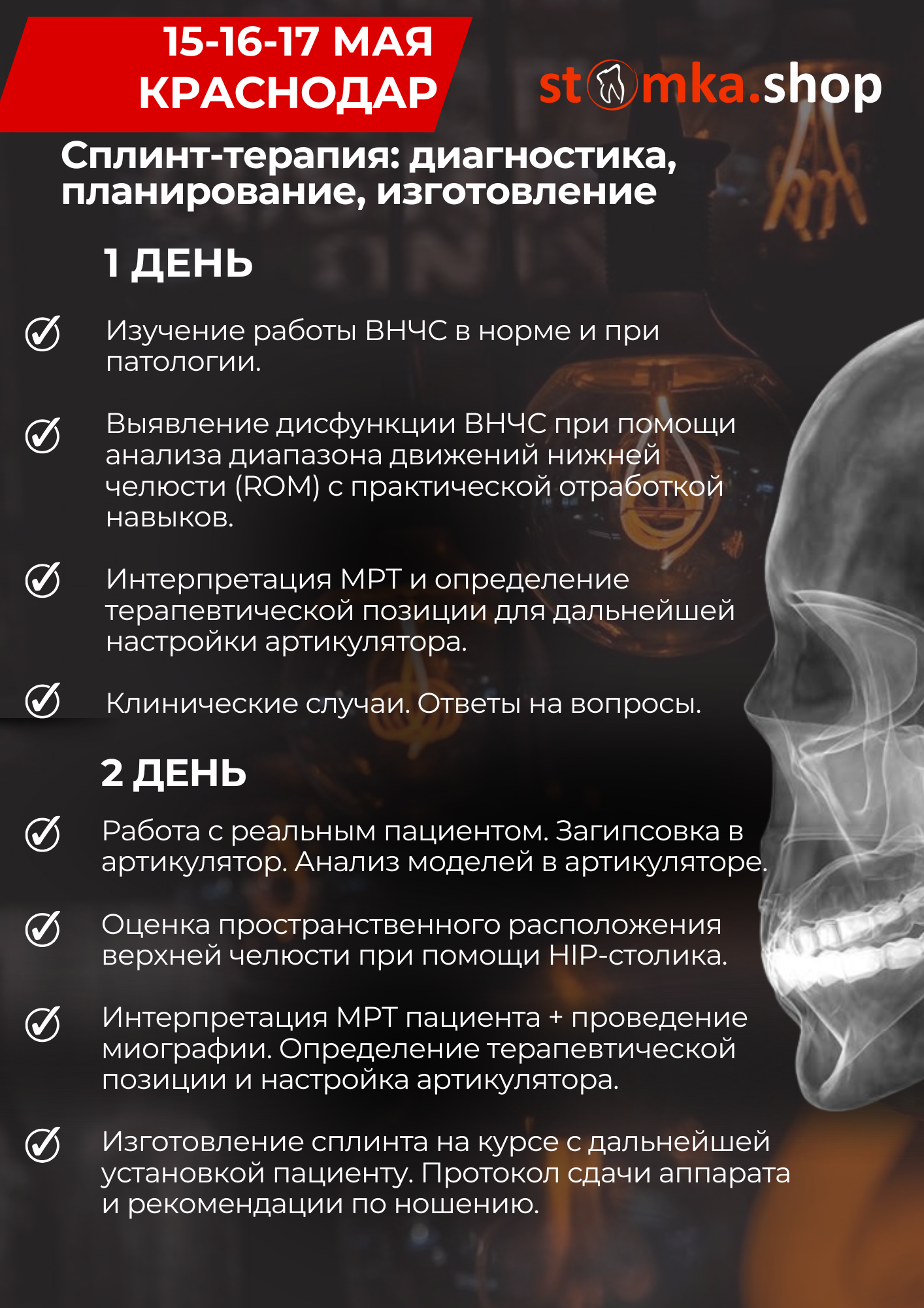 - Выявление дисфункции ВНЧС при помощи анализа диапазона движений нижней челюсти (ROM) с практической отработкой навыков.
