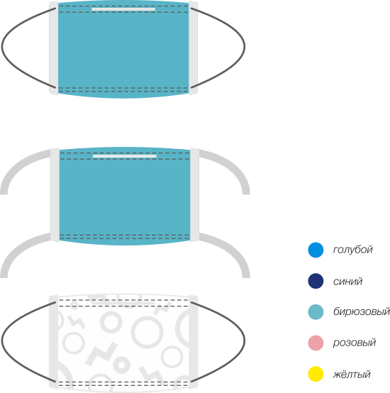Маски одноразовые 3-слойные гипоаллергенные с фиксатором на переносице. Основной фильтрующий элемент маски — средний слой, состоящий из мельтблауна. Эффективность бактериальной фильтрации — 99%. Увеличенная глубина складок маски позволяет удобно расположить ее на лице. Маска фиксируется на голове при помощи мягких резинок или завязок.¶Для применения в педиатрии выпускаются маски на резинке с детским рисунком.¶Маски, упакованные по 100 и 50 шт. в коробки, применяются в клиниках. Коробки на верхней крышке имеют перфорацию, удалив верхнюю часть крышки, можно доставать маски непосредственно из коробки, не открывая ее. Маски, упакованные по 10 и 15 шт., удобны для розничных продаж.