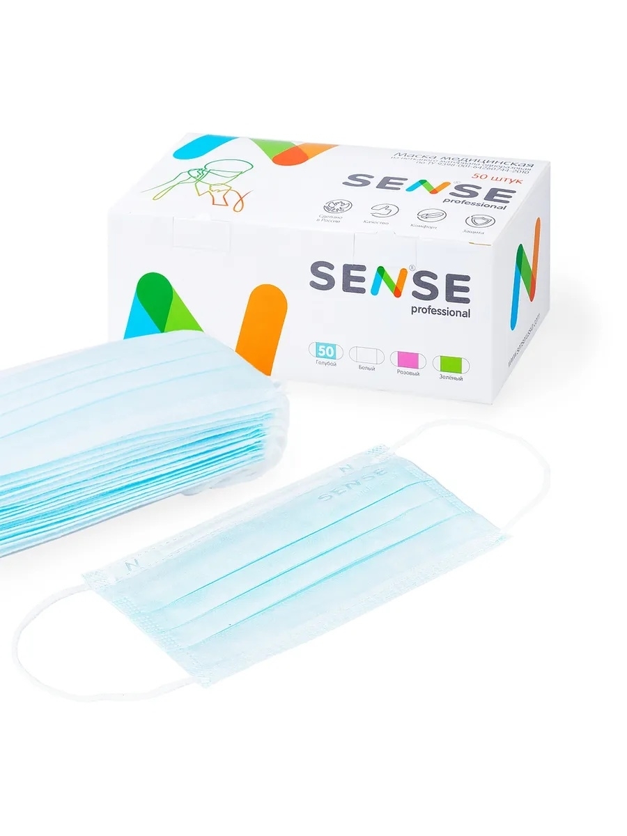 Маски (в картонной коробке) 50шт. Голубые Sense