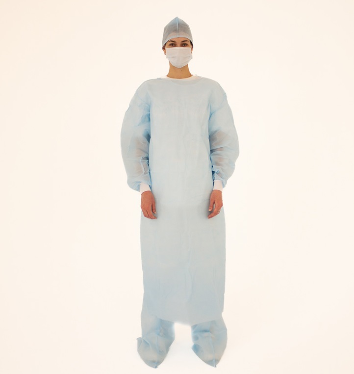 Состав КХ-01: Халат хирургический (рукава на манжете, р-р 52-54, длина 140 см, спанбонд, голубой) -1шт. 2. Шапочка «Колпак» (р-р 60-62, высота -18см, спанбонд, голубой) -1шт. 3. Маска трехслойная на резинке, голубая -1шт. 4. Бахилы высокие (на завязках р-р 39-41, спанбонд, голубой) -1 пара.