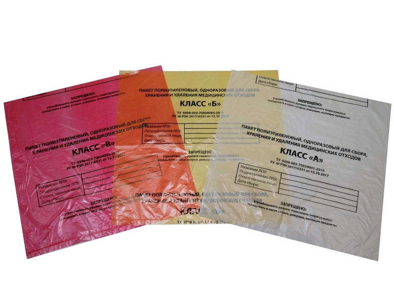 Для сбора, хранения и удаления отходов в медицинских учреждениях используют специальные пакеты. Они одноразовые и производятся из полиэтилена.¶¶Каждый пакет для утилизации медицинских отходов имеет свой класс, который подходит для определенного вида. Например:¶¶ Класс А – используется для утилизации отходов, которые не представляют инфекционную и радиоактивную опасность. В целом это отходы, которые имеют состав близкий к промышленному.¶ Класс Б – подходит для отходов, которые могли контактировать с биологическими материалами. Например, кровь или ткани организма. Такие отходы уже могут представлять опасность для окружающих людей и природы.¶ Класс Б – непосредственно предназначен для отходов, которые использовались при оказании помощи пациенту, имеющему особо опасные инфекции.