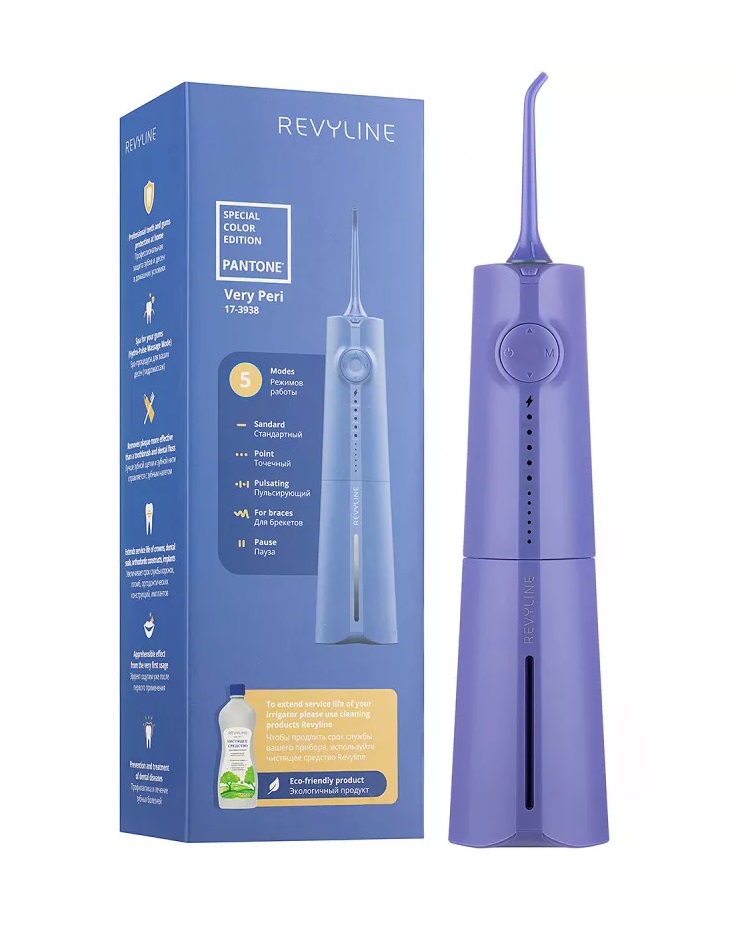 Ирригатор Revyline RL 610 – высокотехнологичная портативная модель в новом фиолетово-голубом оттенке Very Peri, который Pantone назвал цветом года.