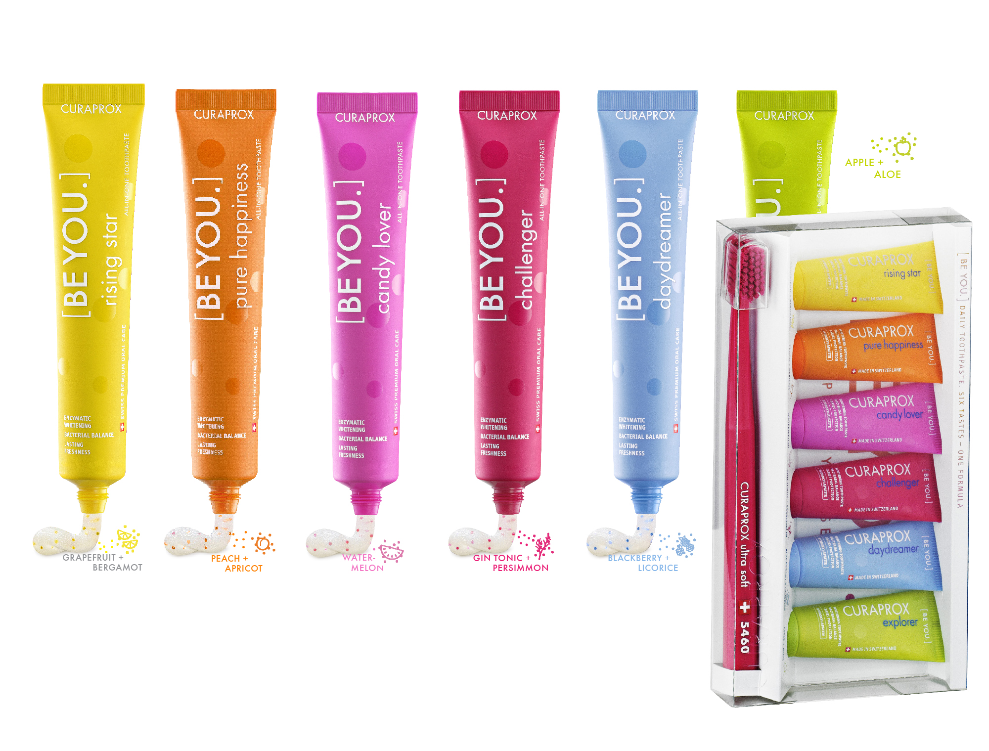 Набор осветляющей зубной пасты Be You, состоящий из зубной щетки Smart и 6 миниатюрных паст с уникальными вкусами - сочного грейпфрута и бодрящего бергамота, алоэ вера и свежего зеленого яблока, сладкого арбуза, ежевики и лакрицы, ягод можжевельника и хурмы, персика и абрикоса Содержит полезные для зубов и десен компоненты. Лактопероксидазная система ферментов защищает, восстанавливает и увлажняет слизистую.
