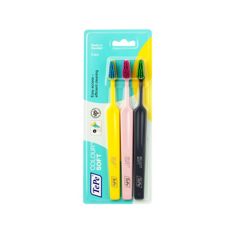 Набор из 3-х зубных щёток с мягкой щетиной TePe® Colour™ Soft для ежедневного ухода за зубной эмалью и дёснами.
