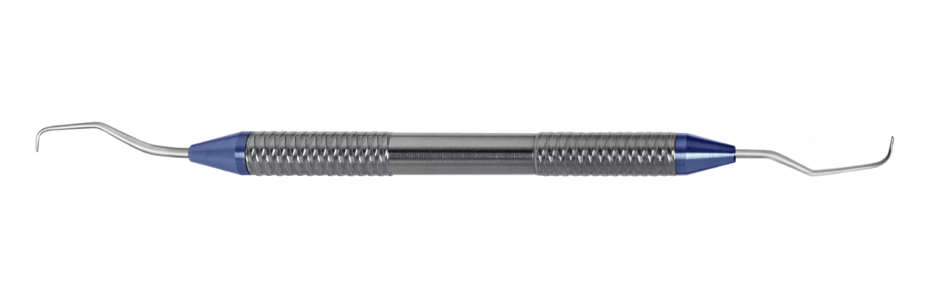 Фронтальные кюретки, предназначены для обработки всех поверхностней фронтальных зубов. На конце рабочих частей наклон 20°, кромка с одной стороны остро заточена, а с другой стороны - притуплена. Носик рабочей части закруглен и остро заточен.