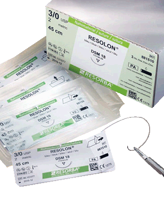 РЕЗОЛОН (RESOLON®) Резолон представляет собой монофиламентный нерассасывающийся хирургический шовный материал из полиамида 6. Полиамид 6 возникает в результате реакции полимеризации Е-капролактама. Выпускается в синей окраске (кислотный синий CI 158), в виде нитей различной толщины и длины. Кроме того, производится в виде комбинации нить-игла. Соответствует требованиям Европейской Фармакопеи к стерильному нерезорбируемому шовному хирургическому материалу.