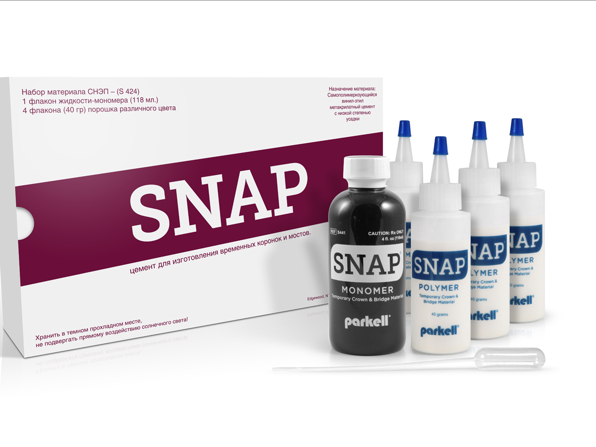 SNAP (СНАП). Самополимеризующийся цемент с низкой степенью усадки для изготовления временных коронок и мостов. Набор материала (1 флакон жидкости-мономера (118 мл), 4 флакона (40 г) порошка различного цвета.