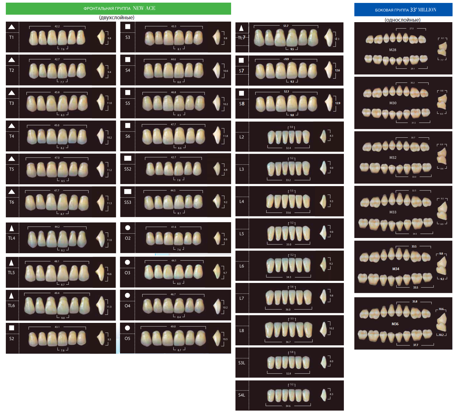 Зубы New Ace / Million (C1), 28 шт - полный гарнитур, акриловые двухслойные / однослойные, Yamahachi (T3M32)