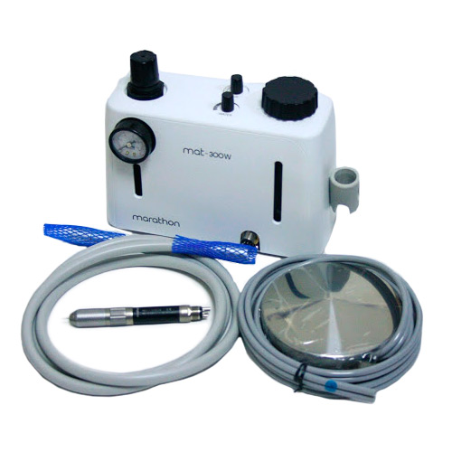 MAT-300W компактная зуботехническая воздушная турбина с пневматической педалью, ёмкостью для воды, регулятором давления и регулятором подачи воздуха и воды. Регулируемая подача водного спрея (водяное охлаждение) позволяет защитить обрабатываемый материал и инструмент от перегрева. Встроенный манометр позволяет контролировать подводимое давление и при необходимости регулировать его. Турбина идеальна для обработки диоксида циркония и безметалловой керамики.