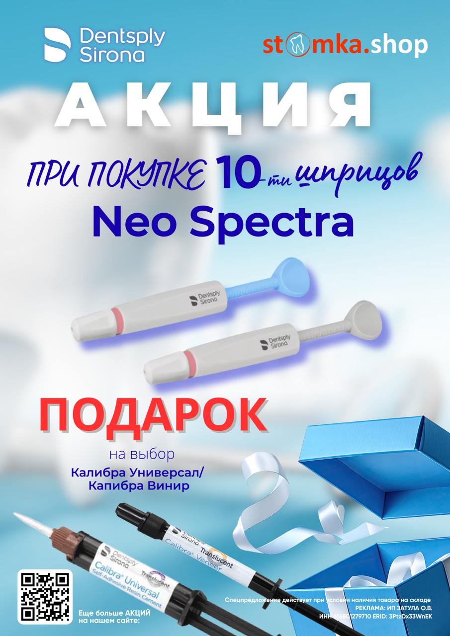 При покупке 10 шприцов Neo Spectra Dentsply вы получаете уникальный подарок! Выбирайте бесплатно один из вариантов: Калибра Универсал (Calibra Universal) или Калибра Винир (Calibra Veneer).
